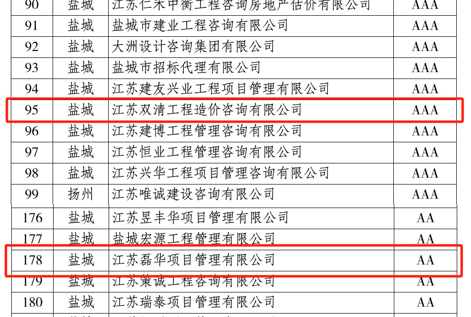 江蘇磊華項目管理有限公司獲得省AA級招標代理信用評價、江蘇雙清工程造價咨詢有限公司獲得省AAA級招標代理信用評價